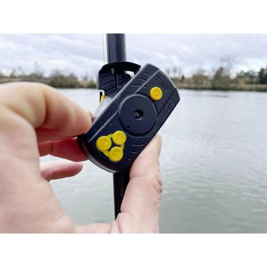 De ontwikkeling van onze nieuwe 2+1 beetmelderset heeft dan wel een kleine zes jaar geduurd, maar nu is hij er: De misschien wel beste beetmelder op de markt! De beetmelders kunnen zeer eenvoudig,dankzij de I-Com Technologie, met de meegeleverde ontvanger verbonden worden. Doordat de Battle Sounder is voorzien van de meest moderne en innovatieve techniek, laat deze voor de moderne meervalvisser niets meer te wensen over. Uiterst nauwkeurig en voor iedere situatie inzetbaar, vanaf nu mis je gegarandeerd geen aanbeet meer! De zeer innovatieve adapter, waarmee de beetmelder zeer snel geplaatst of verwijderd kan worden, is maar een van de vele kenmerken. Binnen zeer korte tijd kan de beetmelder van de hengelblank verwijderd worden, zo kan er supersnel gereageerd worden en kan de beetmelder door deze eenvoudig te draaien, gemonteerd of verwijderd worden. Naar wens kan de adapterplaat na het vissen op de hengelblank gemonteerd blijven. De beetmelders kunnen dan eenvoudig in de meegeleverde hardcase opgeborgen worden. Regen, wind, stof en koude trotseert de Battle Sounder zonder problemen. Door een IPP test (Ingress Protection Code – bescherming tegen indringen van water en stof) in de klasse 6 is vastgesteld dat de beetmelder water- en stofdicht is. De complete behuizing is verzegeld en daarmee hebben inwerkingen van buitenaf geen invloed op de beetmelder. Toonhoogte en gevoeligheid kunnen in acht verschillende instellingen aangepast worden en de alarm-LED kan in verschillende kleuren geprogrammeerd worden. Zo gauw de beetmelder aan de opgestelde en op spanning gebrachte meervalhengel geactiveerd is, meet deze zelf de hoek waaronder de op spanning gebrachte hengels staat en kan op elk moment het alarm af laten gaan. De fijn- afstelling, onder invloed van de wind, golven en bewegingen van de aasvis, gebeurt dan door de sportvisser zelf d.m.v. de smart touch modus. De Battle Sounder beschikt over een digitale, dynamische beetherkenning, een zeer gevoelig instelbaar neigingsalarm en een terugstootalarm – ook wel snapback alarm genoemd. Een highlight is de in de Battle Sounder ingebouwde bootmodus, die het de visser mogelijk maakt om de gevoeligheid d.m.v.vier instellingen te reguleren, een erg handige functie wanneer je met hengels op een schommelende boot aan het vissen bent. Middels de hoogwaardige, conische luidspreker kan de geluidssterkte naar wens ingesteld worden om de alarmtoon weer te geven. De beetmelder kan ook in een stille modus gezet worden, de aanbeet wordt dan weergegeven door de LEDs op de ontvanger. Het apparaat beschikt bovendien over een nachtlichtfunctie. De Battle Sounder verbruikt zeer weinig energie en heeft een geïntegreerd waarschuwingssignaal wanneer de batterijspanning te laag wordt.