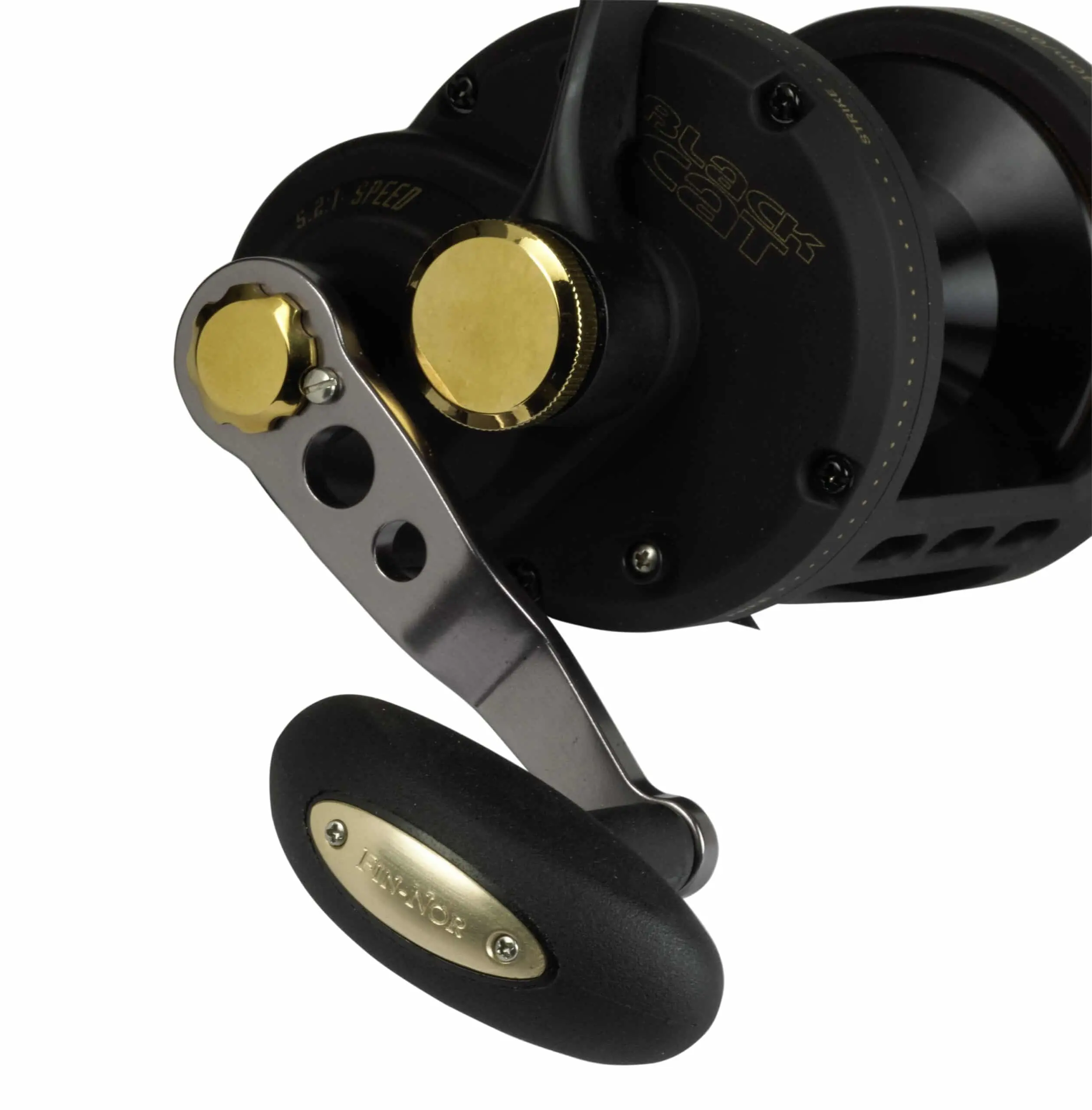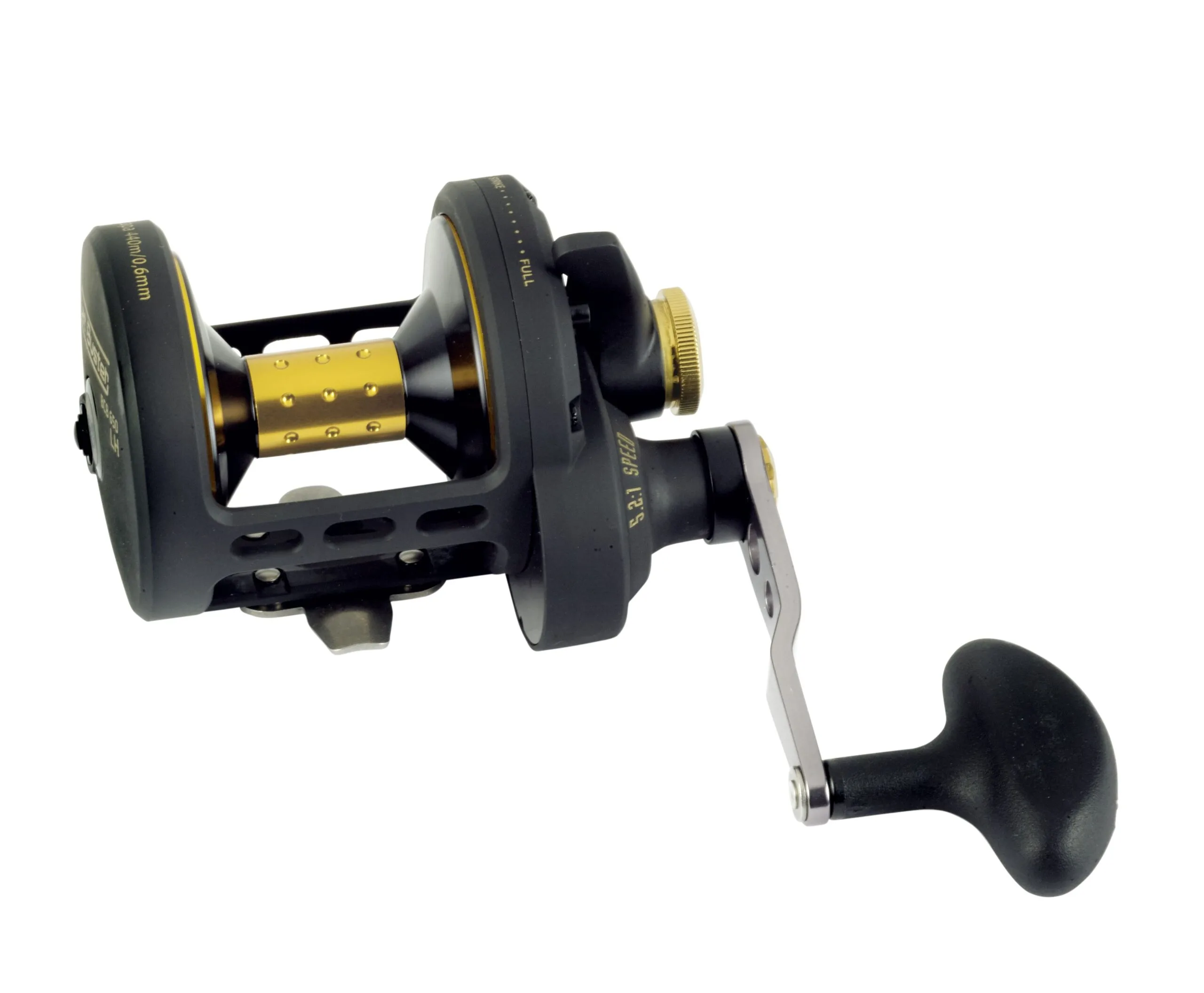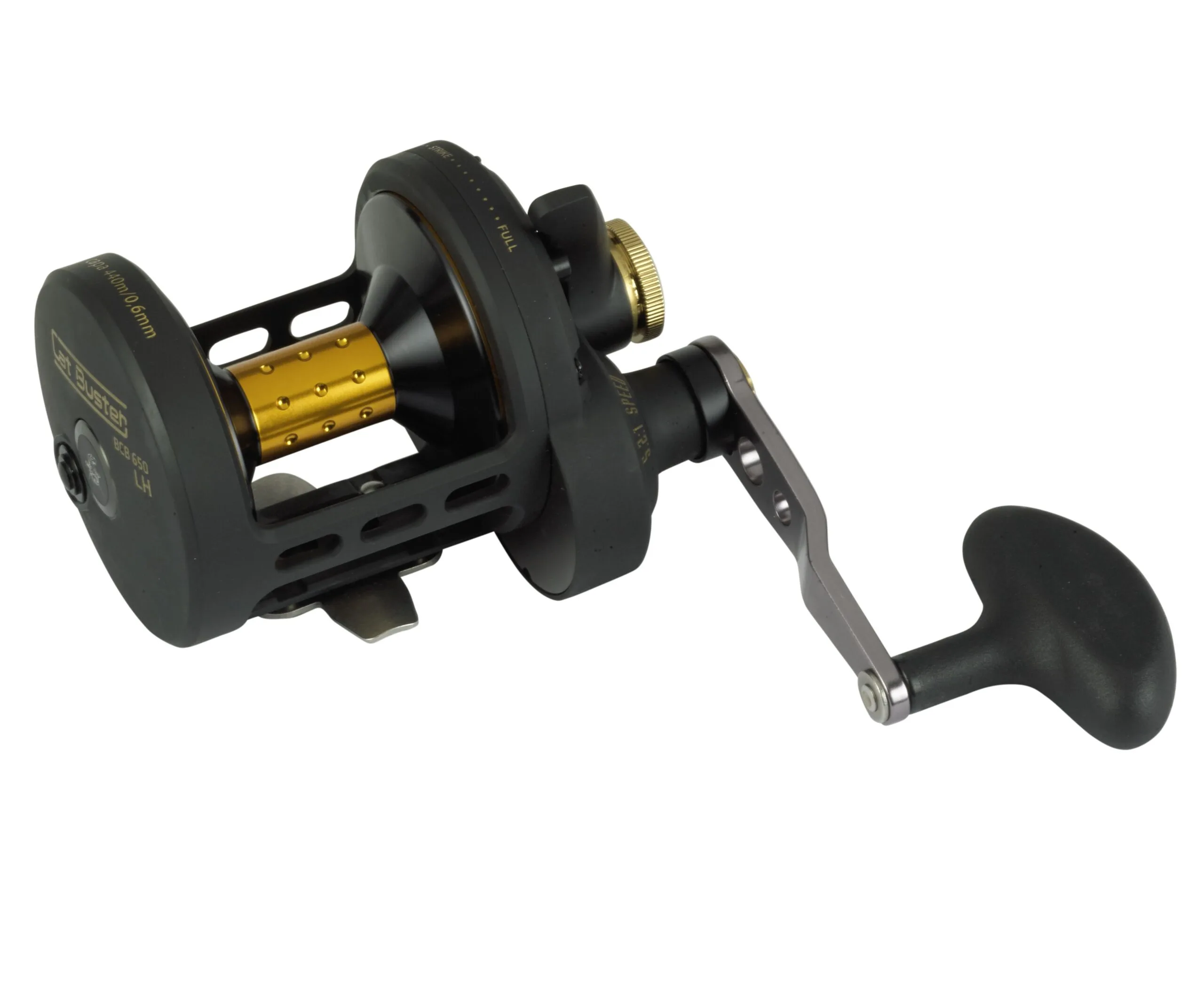 Black Cat Buster LH BCB 650: Multiplier molens zijn onmisbaar geworden in de moderne meervalvisserij. Talloze voordelen op het gebied van lijncapaciteit, gecontroleerde lijngeleiding bij het leggen van het aas en enorme krachtoverdracht tijdens het gevecht spreken voor hun gebruik. Veel meervalvissers geven er de voorkeur aan om een linkshandig model te gebruiken. Door de Buster 650 LH op de markt te brengen, biedt Black Cat precies dit soort gereedschap! De Buster 650 LH is gebaseerd op een aluminium behuizing uit één stuk en heeft een netto gewicht van slechts 750 gram. De hoge overbrengingsverhouding van 5,2:1 zorgt voor een lijn van 110 cm, waardoor het aas moeiteloos en snel kan worden opgehaald, zelfs van lange afstanden. Met een lijncapaciteit van 450 m bij een lijndiameter van 0,5 mm kan zelfs op zeer verre stekken probleemloos gevist worden. Het supersterke, fijn afstelbare MegaDragTM-hendelremsysteem levert een enorme sleepdruk van 16 kilo, die elke denkbare tegenstander dwingt om te draaien. De grote en ergonomische handgreep maakt het mogelijk om moeiteloos te vissen en stelt je in staat om grote tegenstanders veilig te hanteren. We hebben bewust een lijngeleider en een zogenaamde T-bar weggelaten. Dit zorgt voor een perfecte lijnloop en geeft de visser te allen tijde toegang tot de spoel om de sleepdruk met de hand verder te verhogen. Dankzij de relatief smalle maar diepe spoel ligt de lijn perfect bij het binnenhalen van het aas.